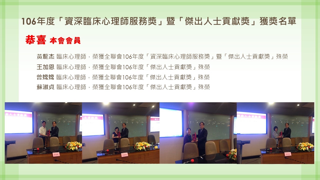106年度「資深臨床心理師服務獎」暨「傑出人士貢獻獎」獲獎名單